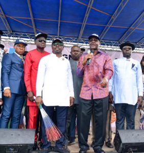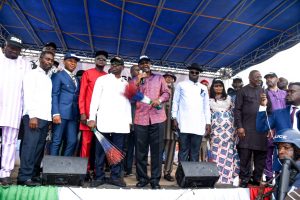 Senator Magnus Abe and his friends on stage at the National School Field in Okrika.